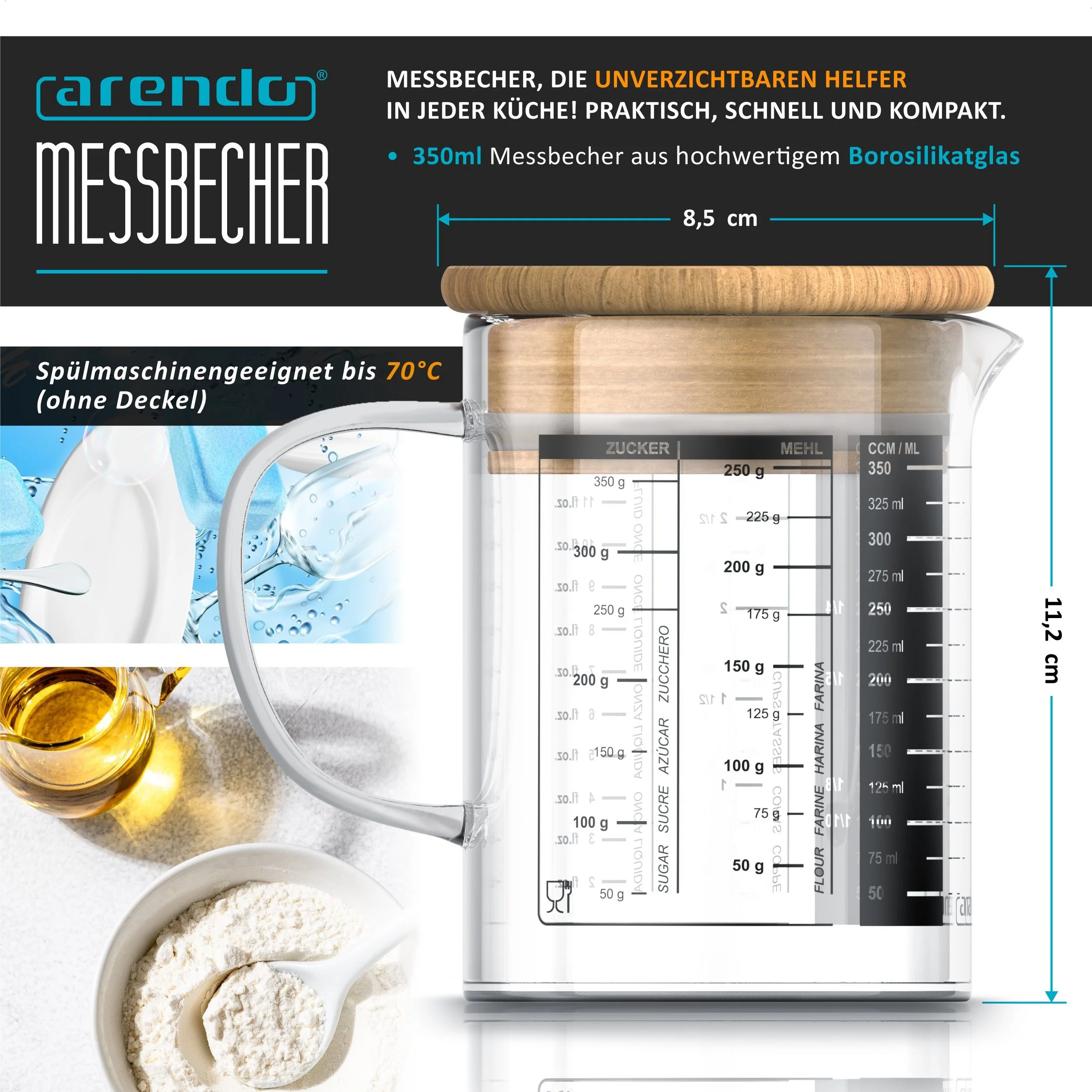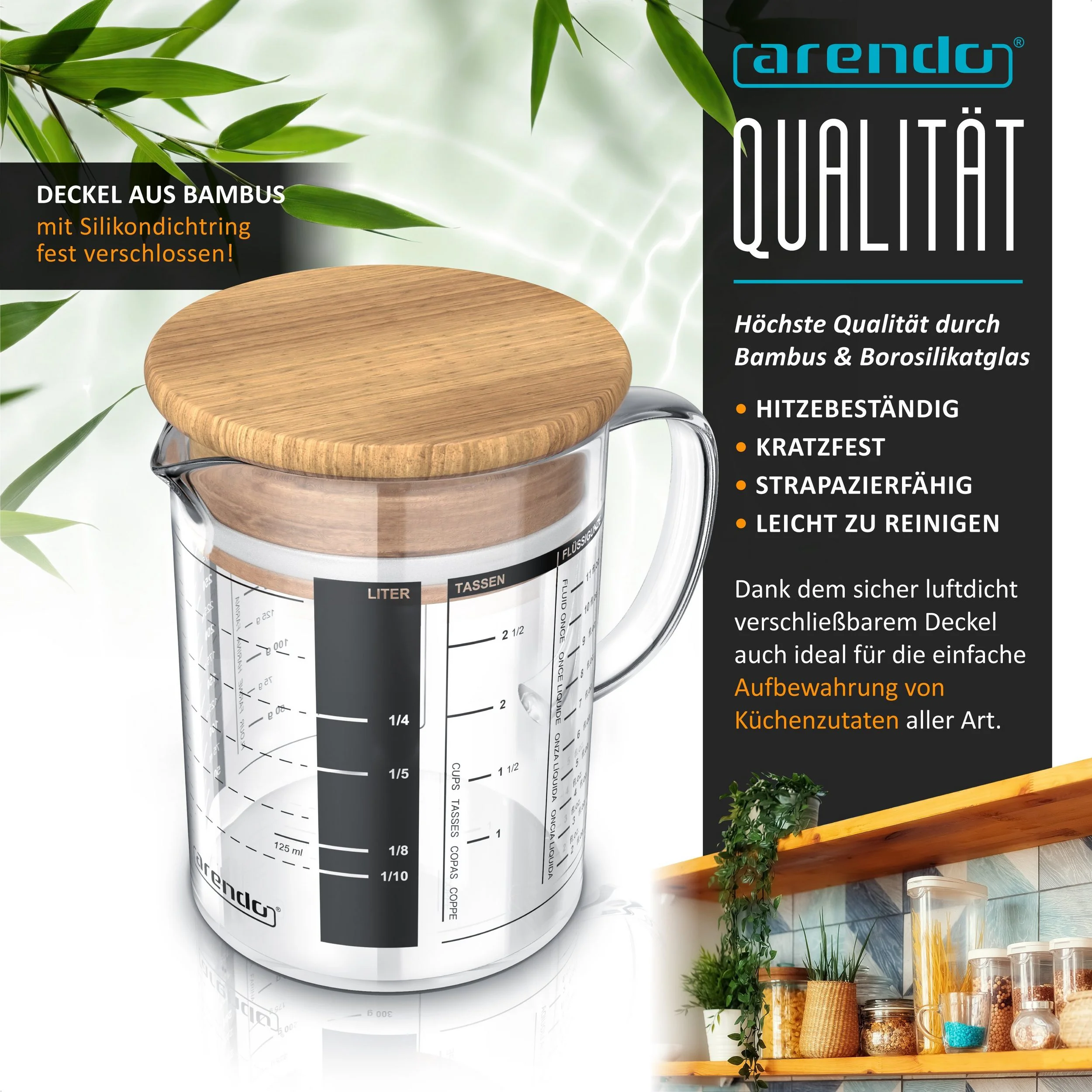 Der Arendo Glasbehälter mit 350 ml Fassungsvermögen vereint präzises Abmessen mit praktischer Aufbewahrung. Hergestellt aus hitzebeständigem Borosilikatglas und ausgestattet mit einem Bambusdeckel samt Silikondichtung, hält er Lebensmittel frisch, trocken und aromatisch. Ideal für Zucker, Mehl, Gewürze, Flüssigkeiten oder Süßigkeiten.