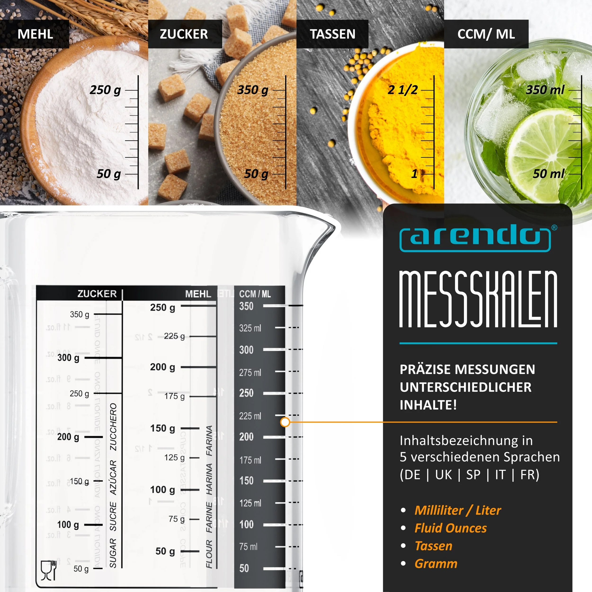 - Skalen: 8-fach – Liter, ML, FL.OZ, Salz, Zucker, Mehl, Tassen (EU), Grieß