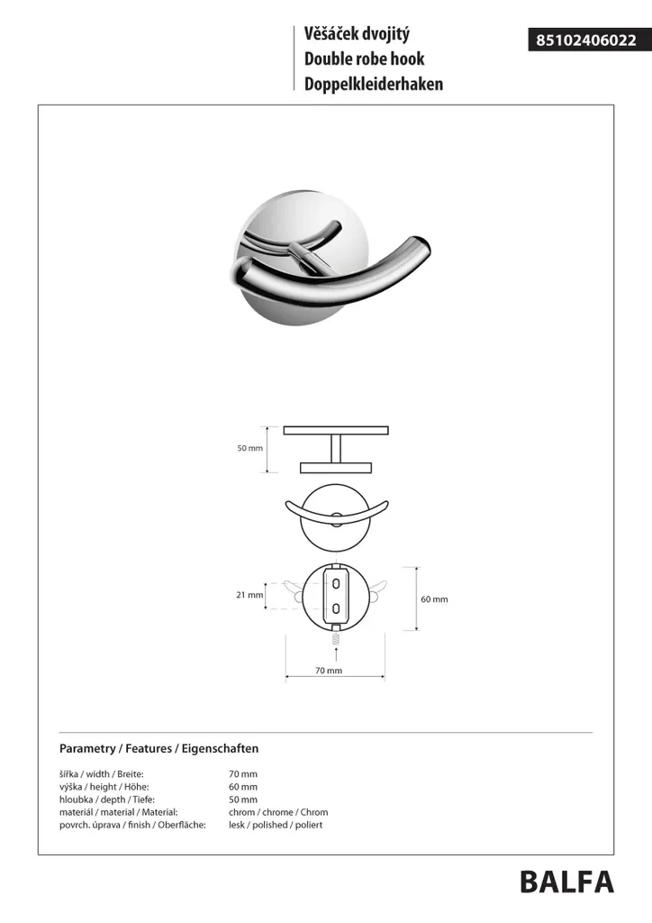 Der BALFA Doppelkleiderhaken aus poliertem Chrom-Zink (70 x 60 x 50 mm) kombiniert minimalistisches Design mit praktischer Funktionalität. Ideal zum Aufhängen von Handtüchern, Bademänteln oder Küchenutensilien. Durch das hochwertige Chrom-Finish wirkt der Haken elegant und modern. Montage erfolgt klassisch zum Bohren, für festen und sicheren Halt an der Wand.