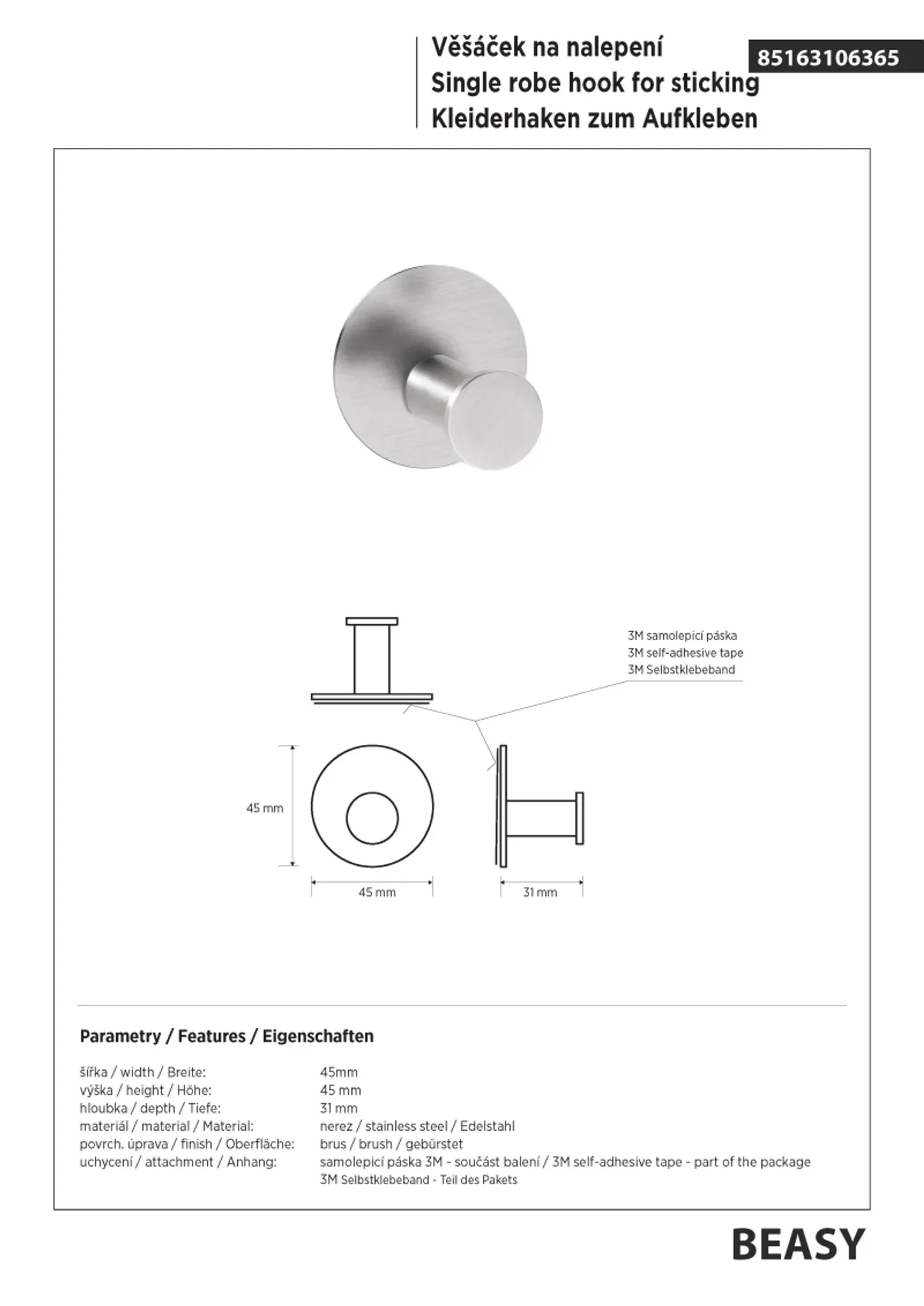 Der BEASY Kleiderhaken aus gebürstetem Edelstahl (31 x 45 x 45 mm) vereint minimalistisches Design mit hoher Funktionalität. Ideal für Bad, Küche oder Flur, lässt sich der Haken dank der Klebe-Montage ohne Bohren anbringen. Die elegante, moderne Optik passt perfekt zu jeder Einrichtung.