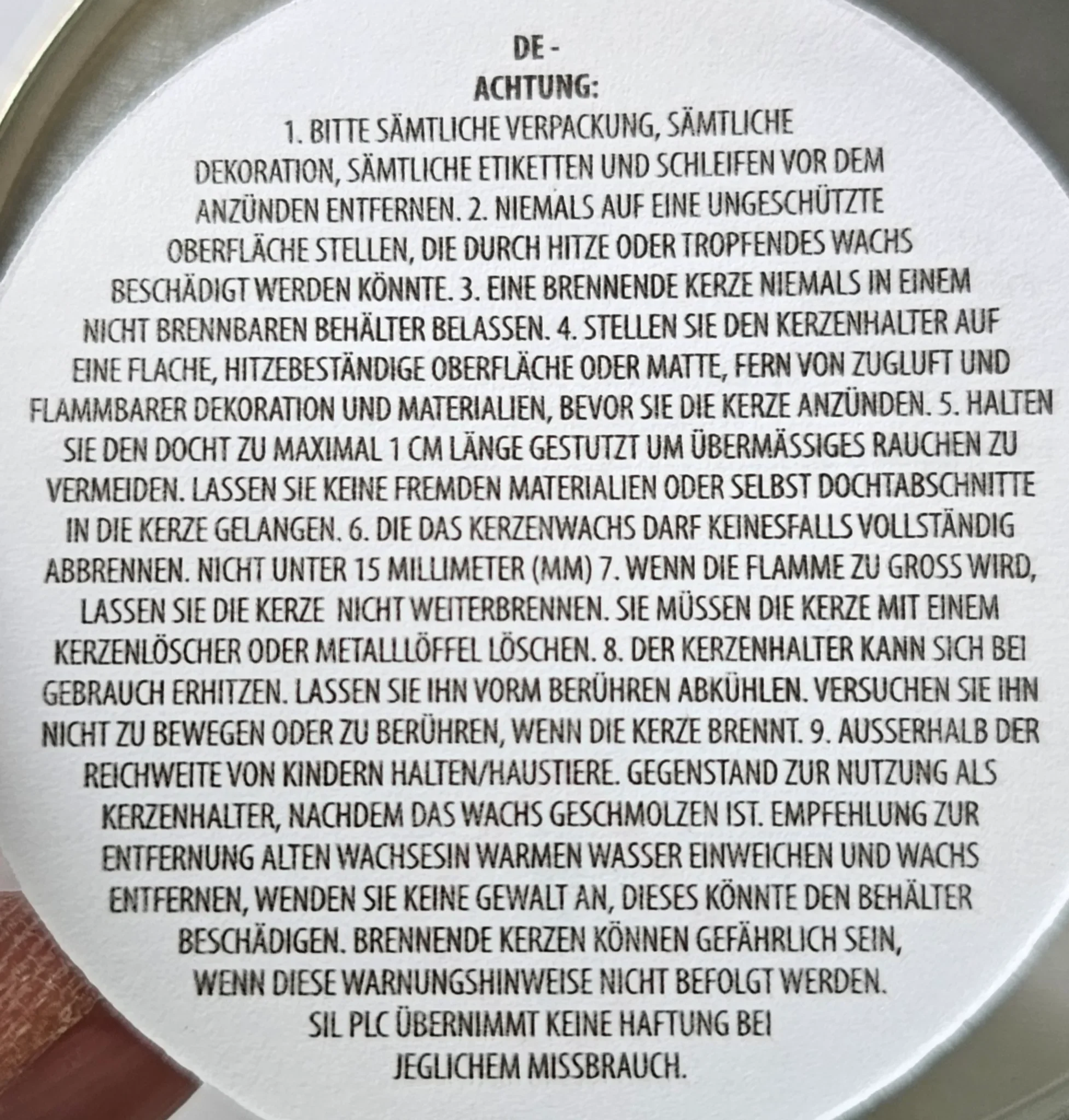 - Farbe: weißer Wachs, silberfarbene Dose mit mehrfarbigem Etikett