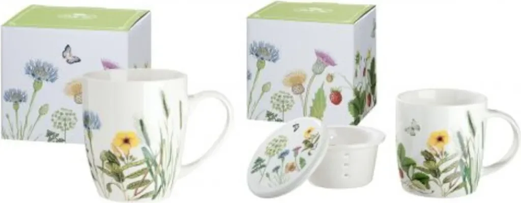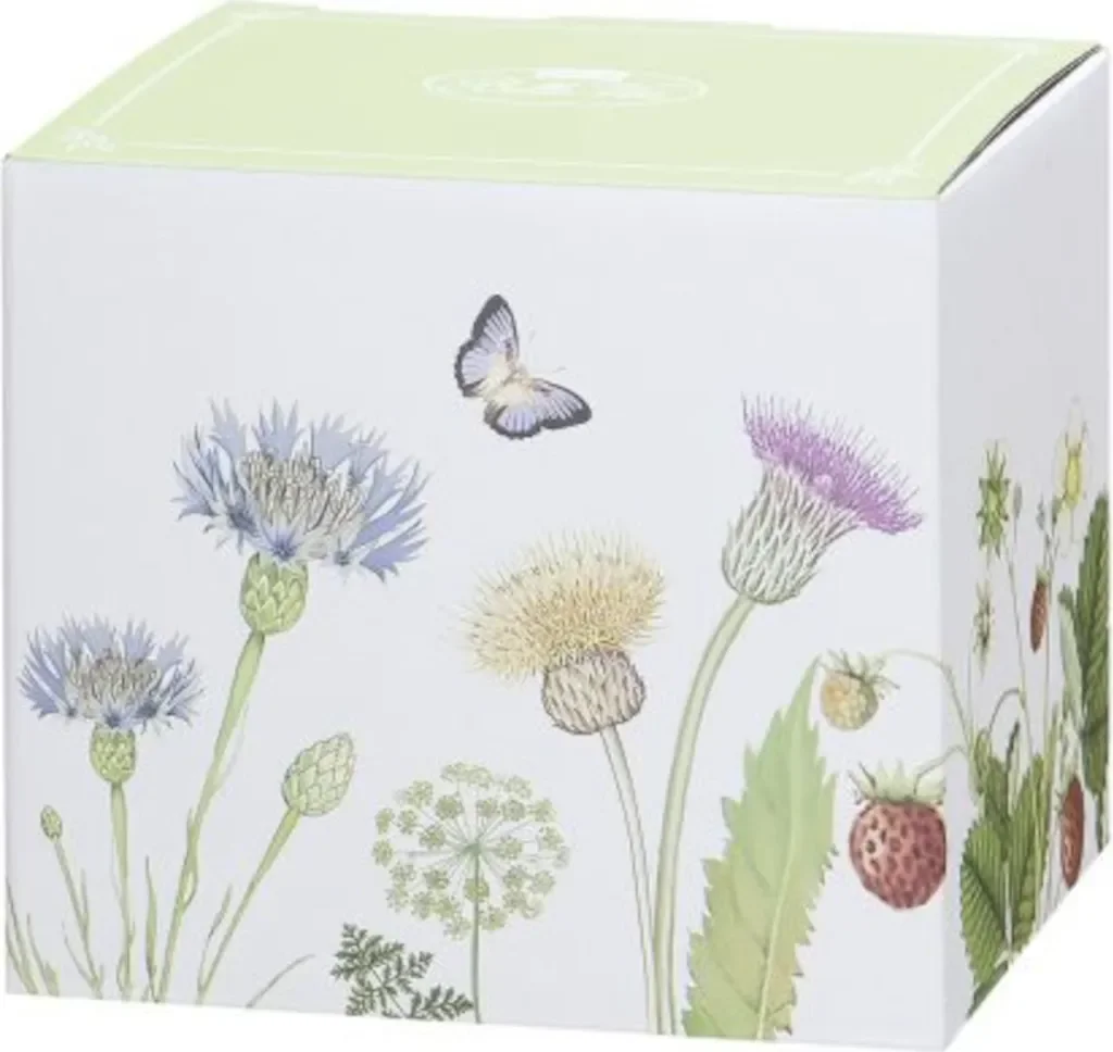 Die Gilde Tasse "Wild Flowers" aus hochwertigem New Bone China Porzellan begeistert mit einem farbenfrohen Wildblumen- und Schmetterlingsmotiv. Mit einem Fassungsvermögen von ca. 300 ml ist sie ideal für Kaffee, Tee oder heiße Schokolade. Die Tasse ist spülmaschinen- und mikrowellenfest und wird in einem dekorativen Karton geliefert, der das gleiche Blumenmotiv trägt – perfekt auch als Geschenk.