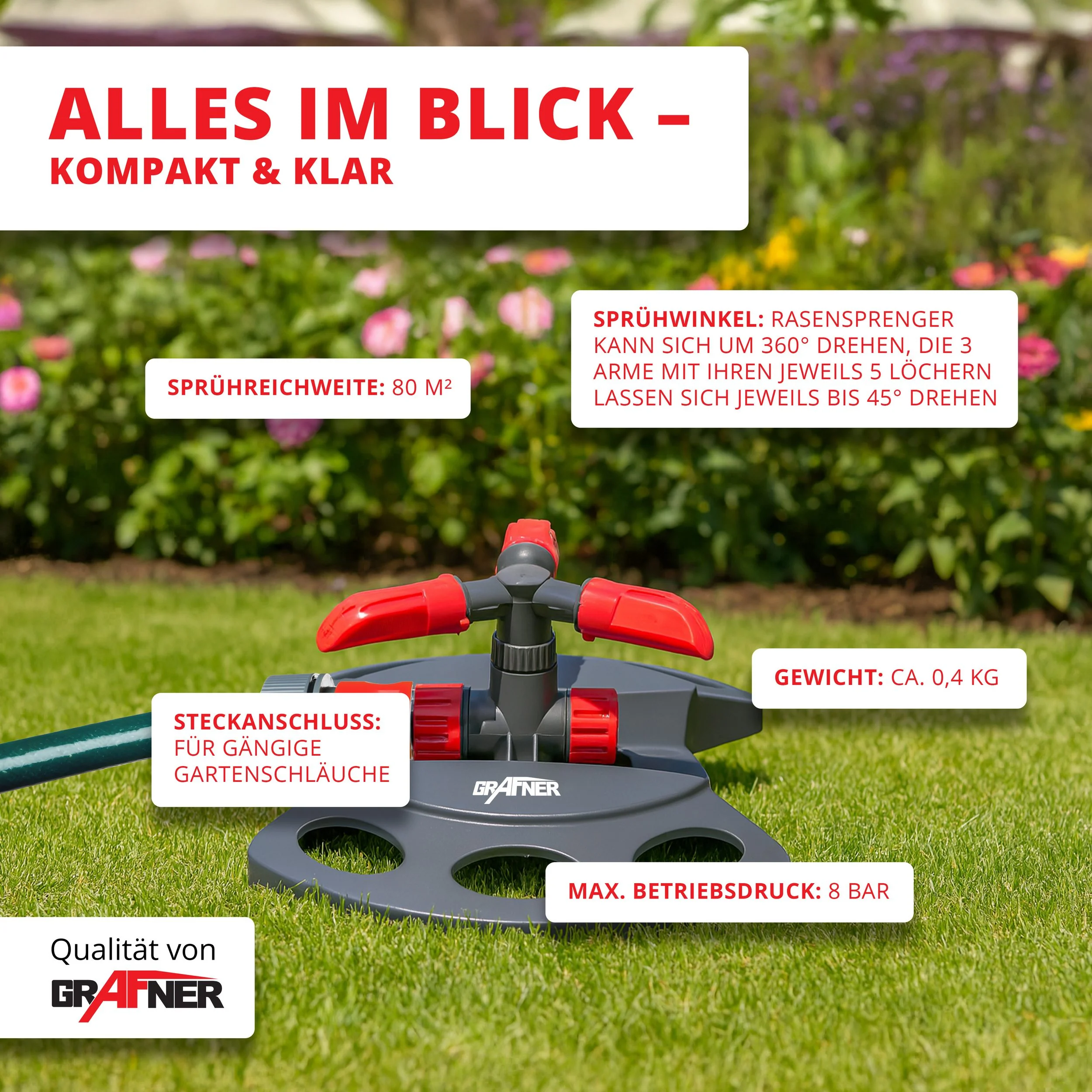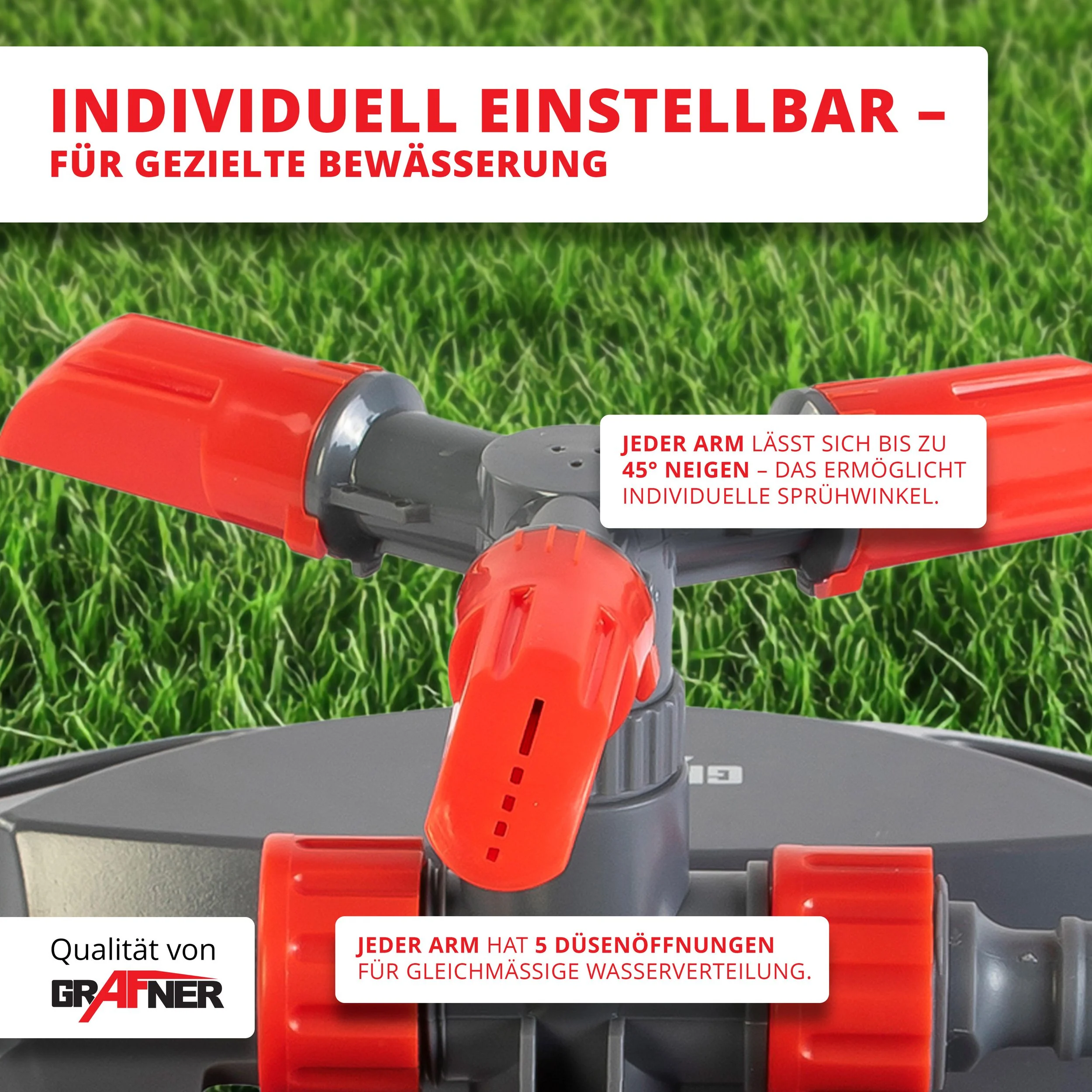 Der leistungsstarke Grafner RS10823 Rasensprenger eignet sich ideal zur gleichmäßigen Bewässerung von Rasenflächen, Gemüsebeeten und Beeten bis zu einer Fläche von 80 m². Die drei rotierenden Arme sind mit feinen Düsen ausgestattet, die eine effiziente Wasserverteilung ohne Pfützenbildung ermöglichen. Durch die individuell verstellbaren Arme (bis zu 45°) kann der Sprühwinkel flexibel angepasst werden – perfekt für unterschiedliche Gartensituationen.