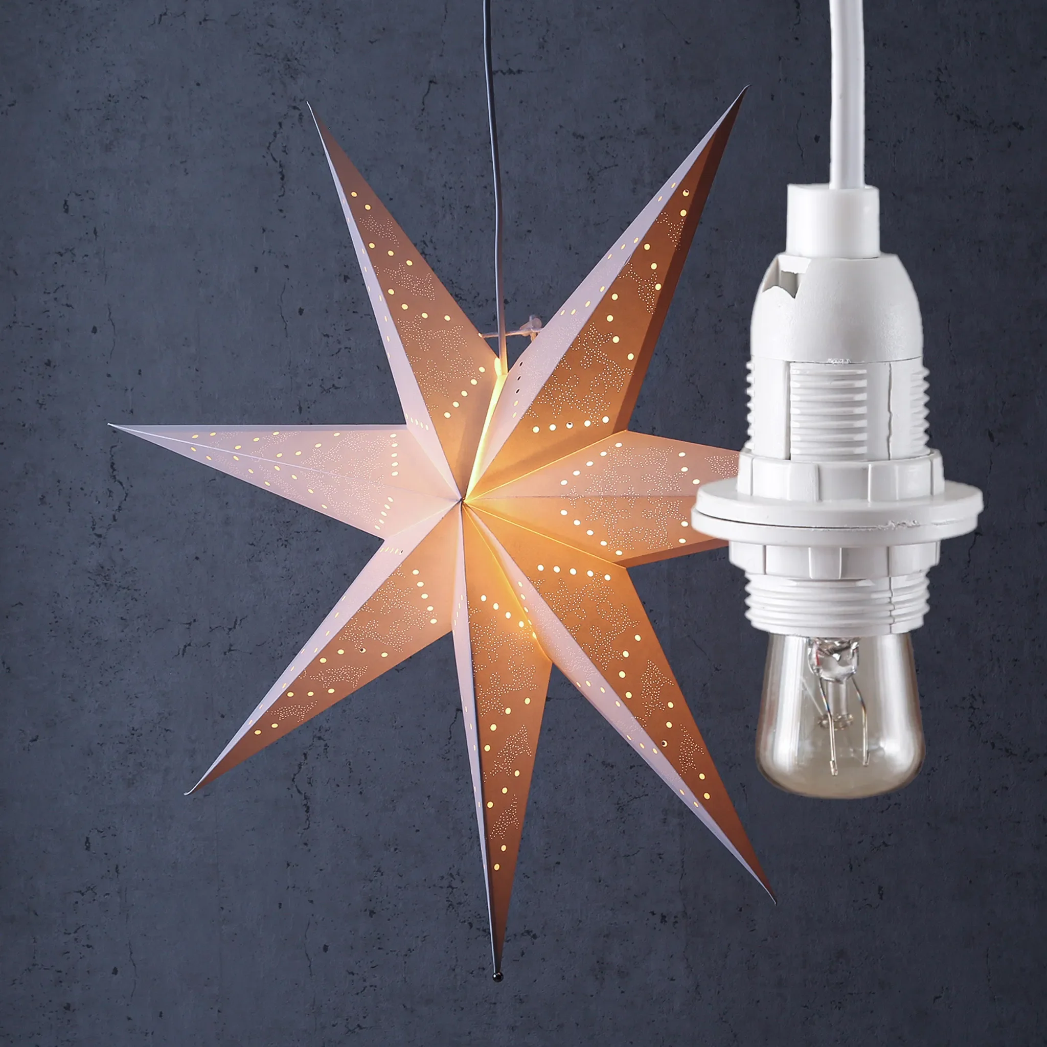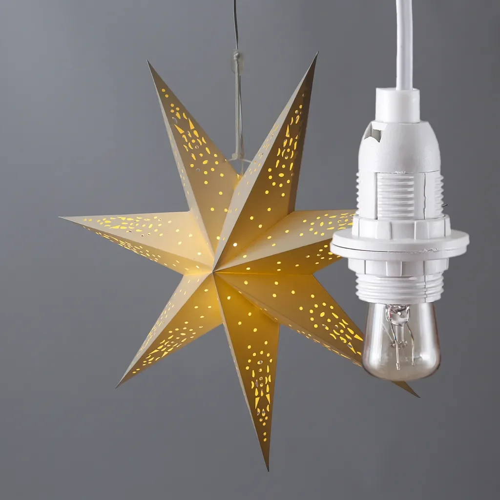 Diese Lampenfassung mit E14-Sockel eignet sich perfekt für Weihnachtssterne, Hängeartikel oder individuelle Pendelleuchten. Das weiße Kabel (3,5 m Länge) mit Eurostecker bietet flexible Gestaltungsmöglichkeiten für kreative Lichtdekorationen im Innenbereich. Maximale Belastung: 25 W.