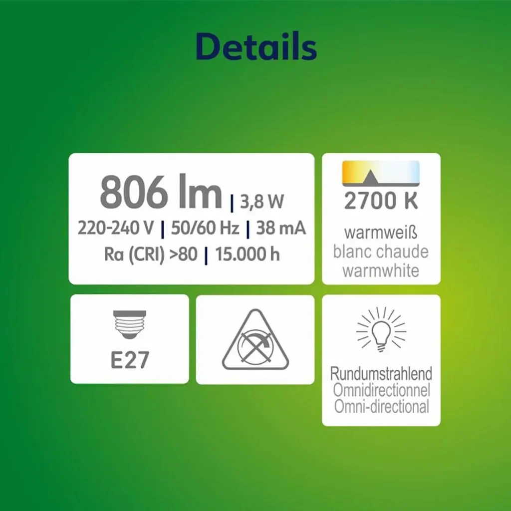 Warmweiß 2700K, 3,8W, 806 Lumen, 15.000 h Lebensdauer