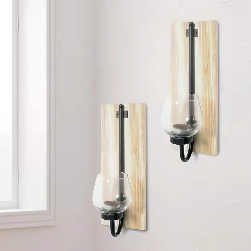 Rustikale Wandkerzenhalter aus Holz, Metall & Glas – 2 Stück