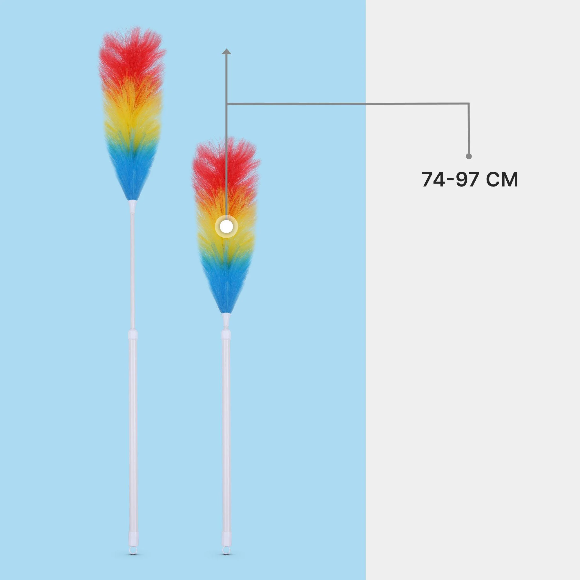 Dieser farbenfrohe Teleskop-Staubwedel ist die ideale Lösung, um Staub und Spinnweben selbst in schwer erreichbaren Bereichen mühelos zu entfernen. Dank des ausziehbaren Schafts lässt sich die Länge flexibel von 74 cm auf bis zu 97 cm anpassen – perfekt für hohe Regale, Türrahmen, Lampen oder Ecken.